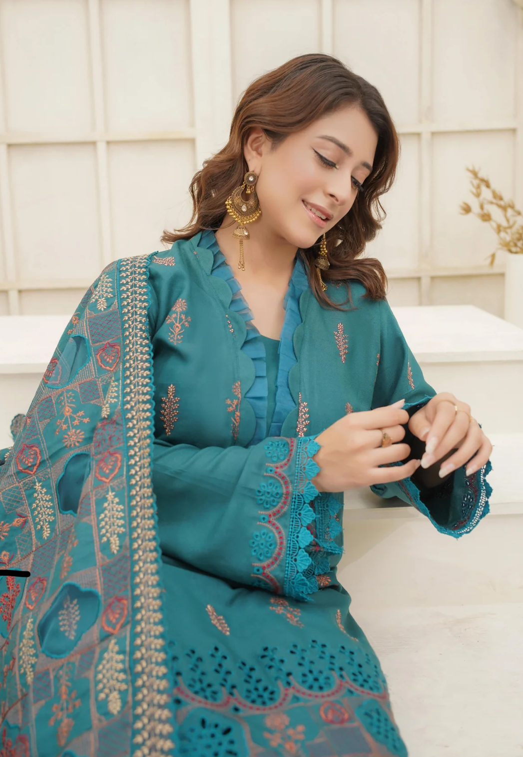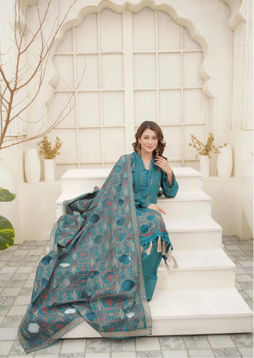 Step into elegance with this premium 3-piece unstitched suit in a graceful teal shade. The shirt front features delicate embroidery with cutwork details, complemented by cutwork and embroidered sleeves and back . Paired with a richly woven shawl, this outfit is the perfect blend of sophistication and seasonal charm.